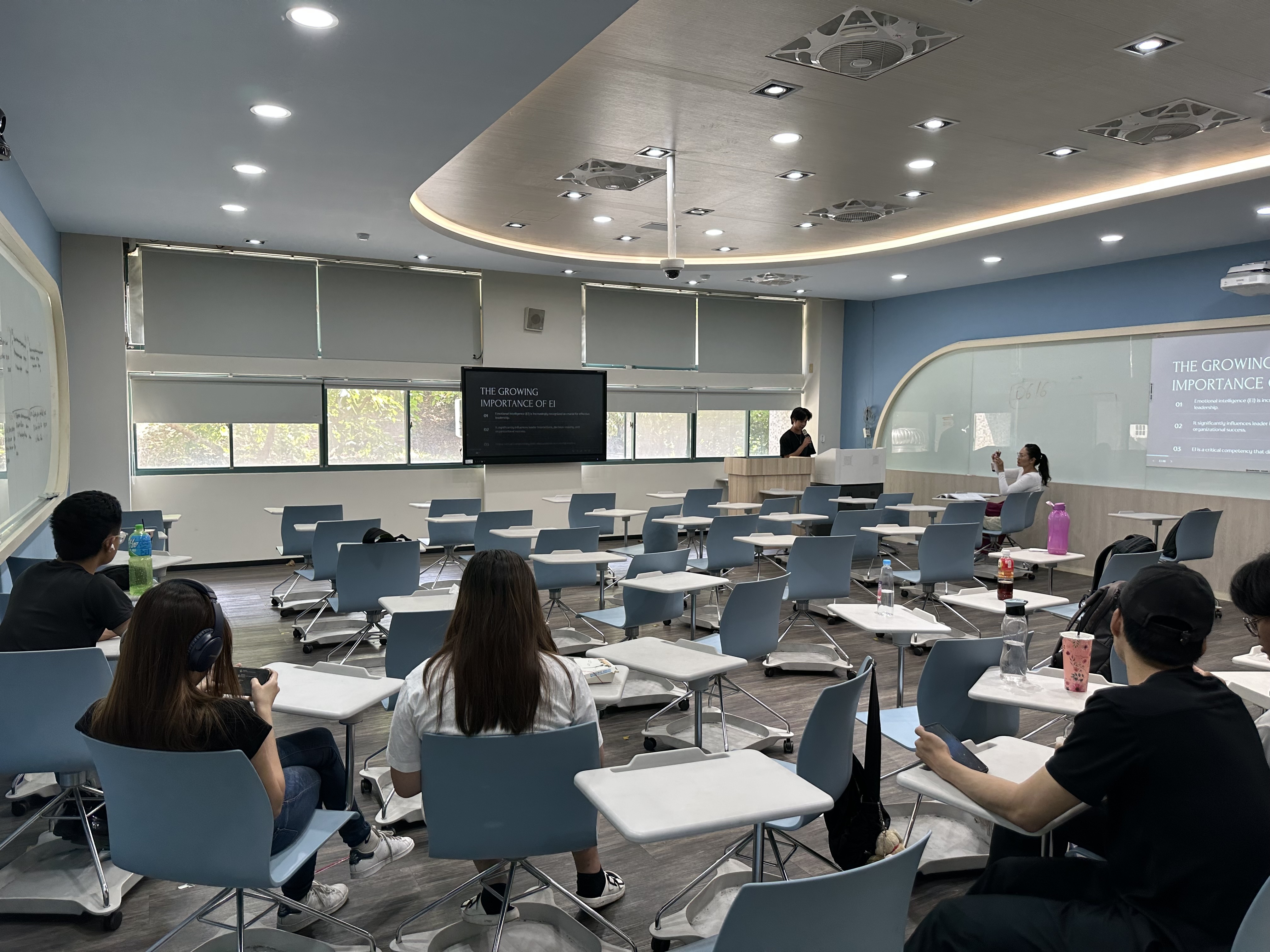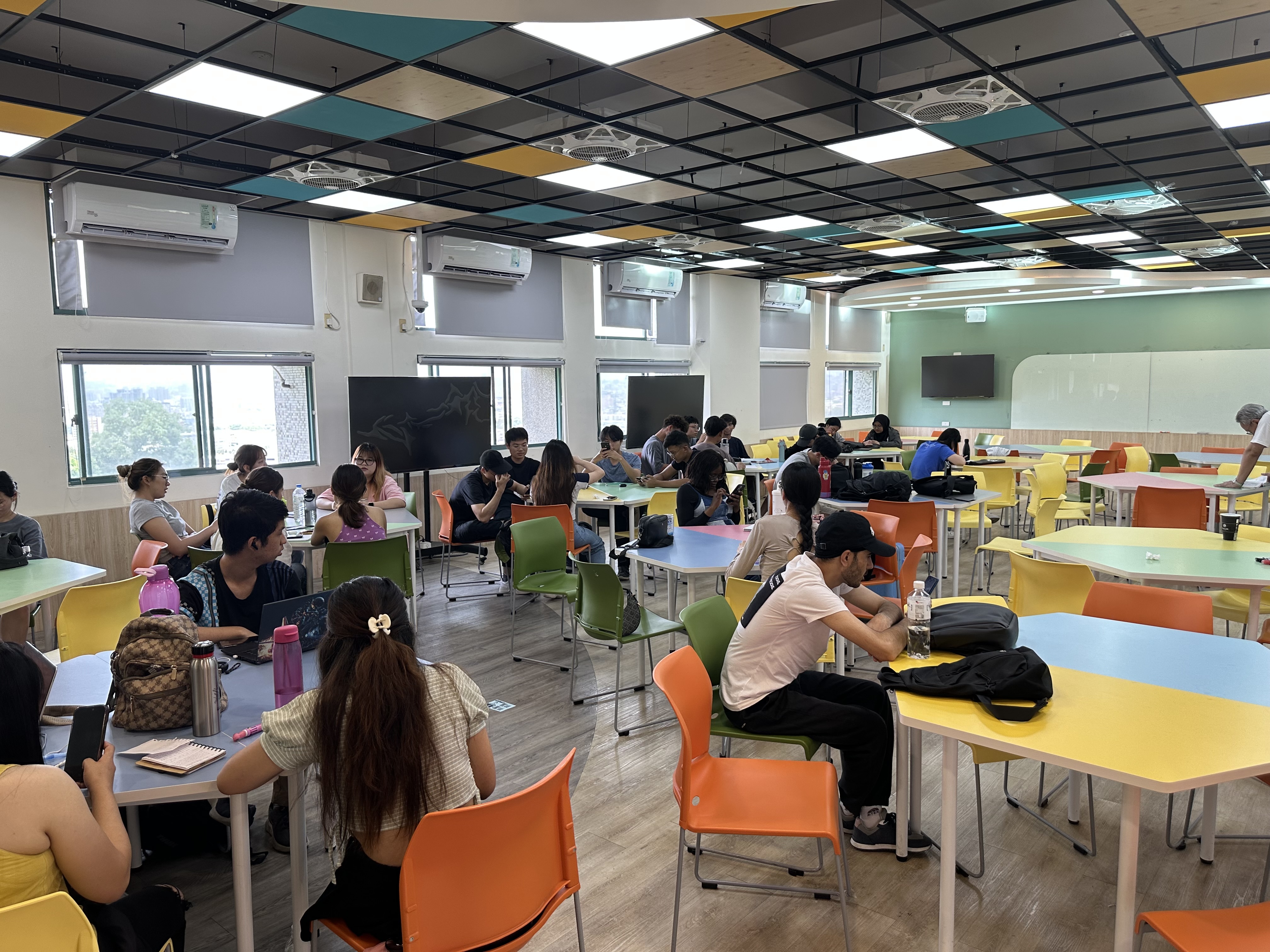 With plenty of natural light, ceiling fans for ventilation, and bright ambient lighting, the environment is both comfortable and conducive to long study sessions. This setting is ideal for classes that require frequent presentations, discussions, or team-based projects.